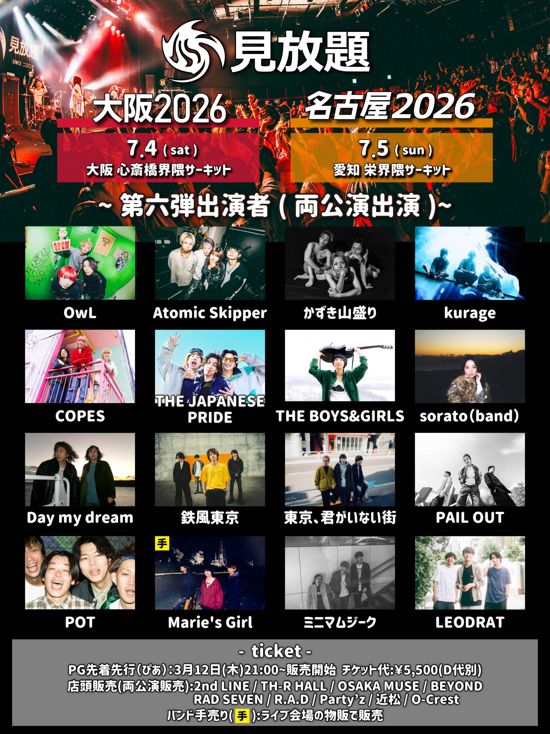 BIGCAT / SUNHALL / CYPRESS LOUNGE BY SUNHALL WEST / SUNHALL B1F / JANUS / OSAKA MUSE / ANIMA / FANJtwice / DROP / BEYOND / VARON / BRONZE / club vijon / AtlantiQs / Pangea / 新神楽 / KING COBRA / hillsパン工場 / HOKAGE